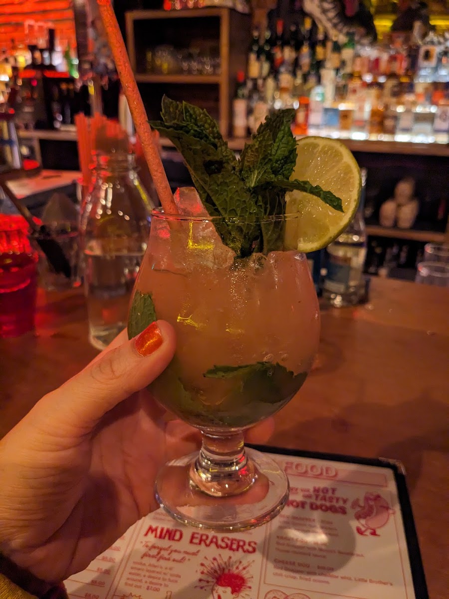 Cool bar in a back alley cobble stone street! Pack with fun and good drinks. Hotdog seem to be one of the specialties on the menu. I didn’t get one, but they did look good. The drinks and the pours are great cool vibe and fun atmosphere.